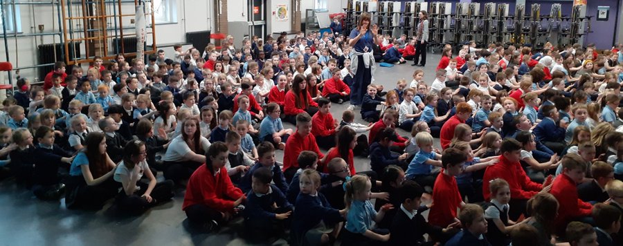 トークセッションでは、100名以上の子どもたちが教室で一斉にストーリーマッサージをやりあう写真が紹介されました。